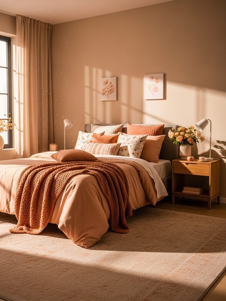 Beige alone can sometimes feel flat, but soft peach changes everything. It adds a gentle warmth that makes the bedroom feel welcoming and comfortable.