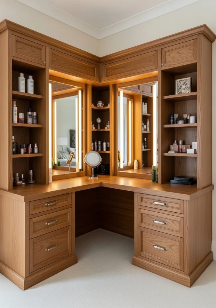 Dedicated jewelry storage in your vanity keeps accessories organized and prevents tangling. Velvet-lined compartments protect pieces while built-in ring holders and necklace hooks make everything accessible. You’ll see your whole collection at once instead of digging through boxes. This integration means you can plan entire outfits in one spot. The organized system also helps you wear more of what you own.