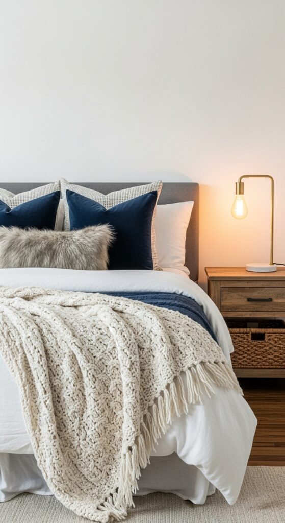 Mix linen sheets with velvet pillows and a chunky knit throw. The combination creates visual interest without overwhelming your space. Add a faux fur accent or woven basket to keep building those layers. Trust me, this trick makes even budget bedding look expensive. It’s all about creating that touchable, inviting vibe that makes you want to dive right in.