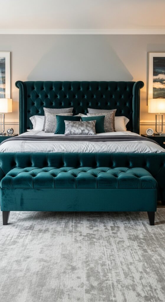 Velvet instantly elevates any bedroom. A velvet headboard, accent chair, or ottoman adds touchable luxury. Jewel tones like emerald, sapphire, or ruby look incredible in velvet. The fabric catches light beautifully and feels as good as it looks. For more upscale velvet ideas, check out luxury master bedroom decor ideas showcasing premium fabrics. It’s indulgence you deserve.