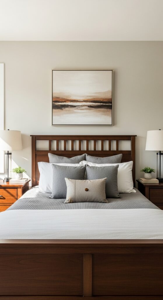 Balance feels good to your brain. Matching nightstands with identical lamps create instant harmony. You don’t need expensive furniture—even budget pieces look polished when they’re symmetrical. This is especially effective in master bedroom decor ideas modern where clean lines and balance rule. Keep the styling simple and let the symmetry do the work.