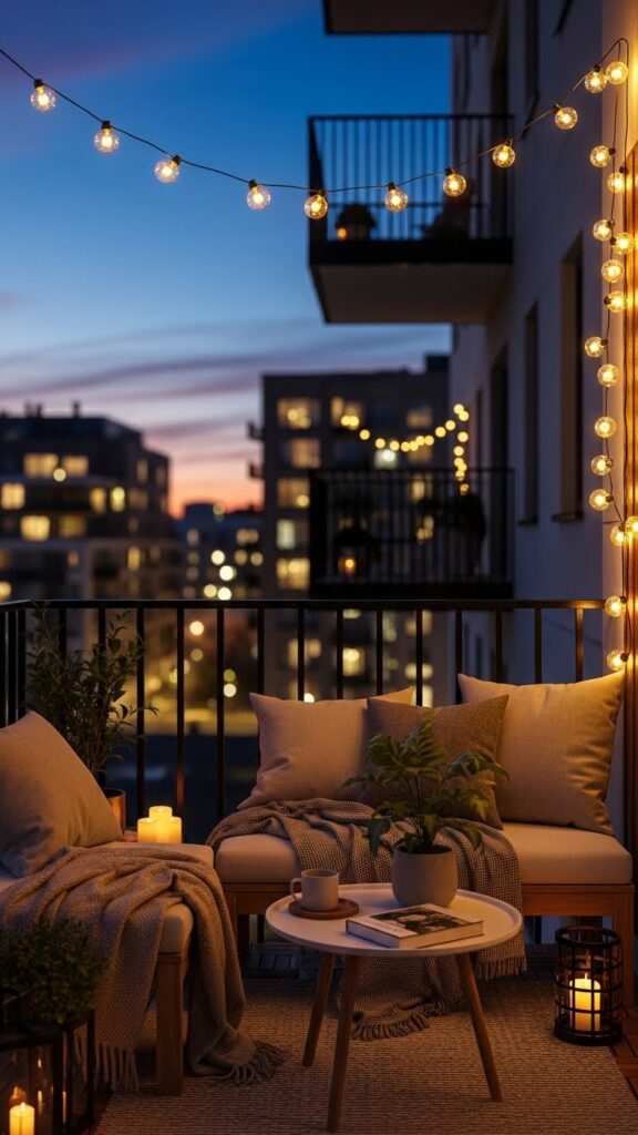 String lights create a warm and welcoming atmosphere in the evenings. According to Apartment Therapy, soft outdoor lighting is one of the easiest ways to make small outdoor spaces feel cozy and inviting.