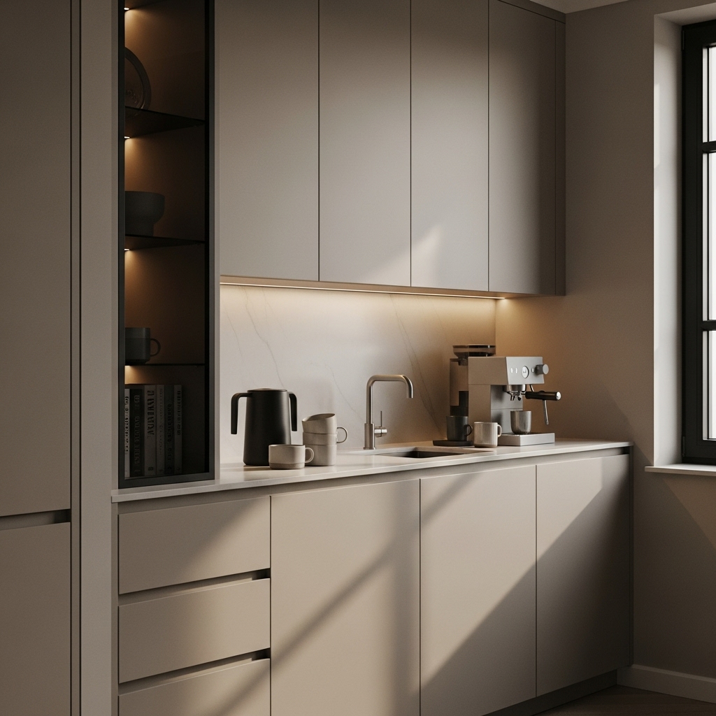 Built-in cabinets create a seamless and clutter-free coffee bar. Appliances and accessories stay hidden, helping the kitchen look clean and organized at all times. This option is perfect for modern and high-end kitchen designs.