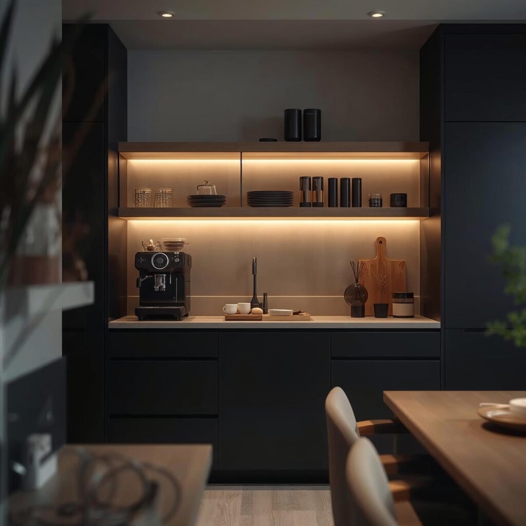 A combination of black finishes and natural wood tones is one of the most popular choices for modern coffee bars. This style creates a clean, balanced, and warm look that blends effortlessly with modern kitchens and open-plan homes. Minimal accessories keep the setup clutter-free while maintaining a premium aesthetic.