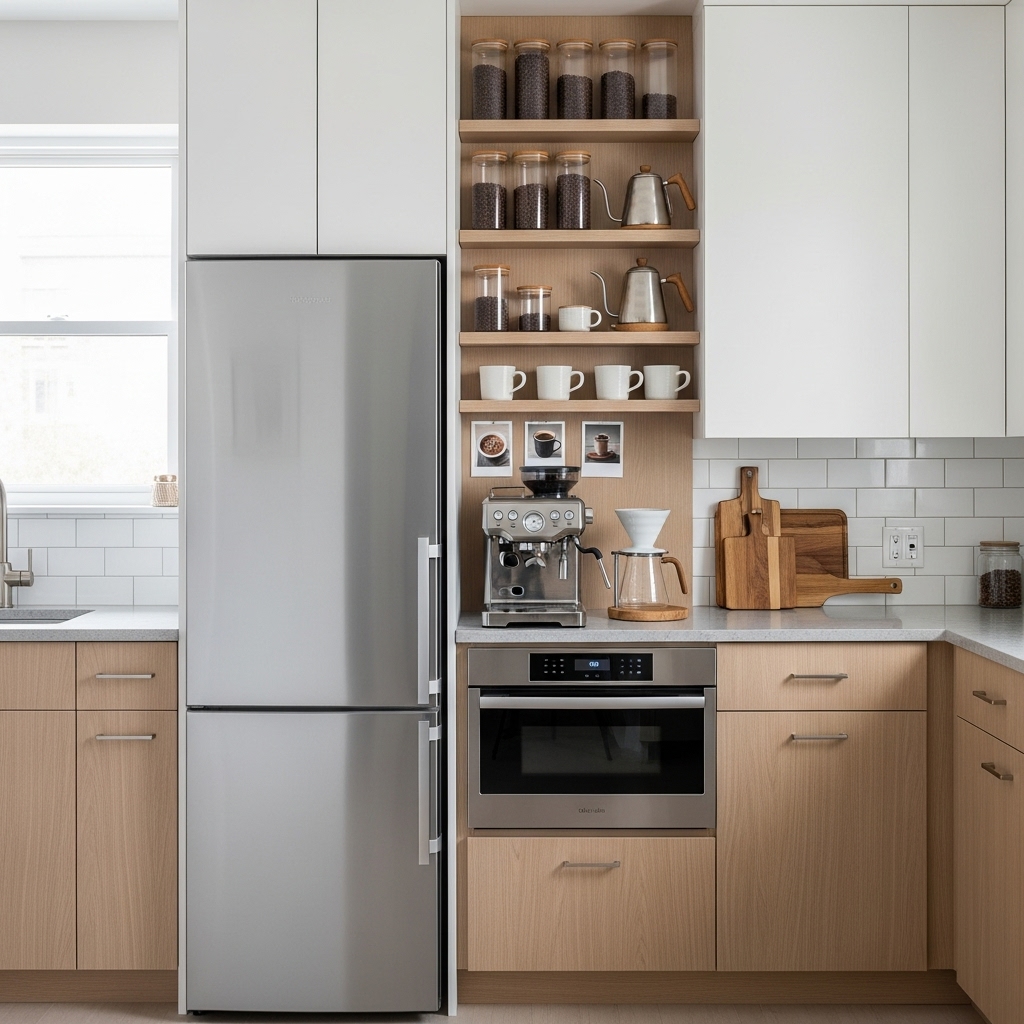 The narrow space beside a refrigerator can be transformed into a slim coffee bar. Tall cabinets or narrow shelving maximize vertical storage, making this a smart space-saving solution for small kitchens.