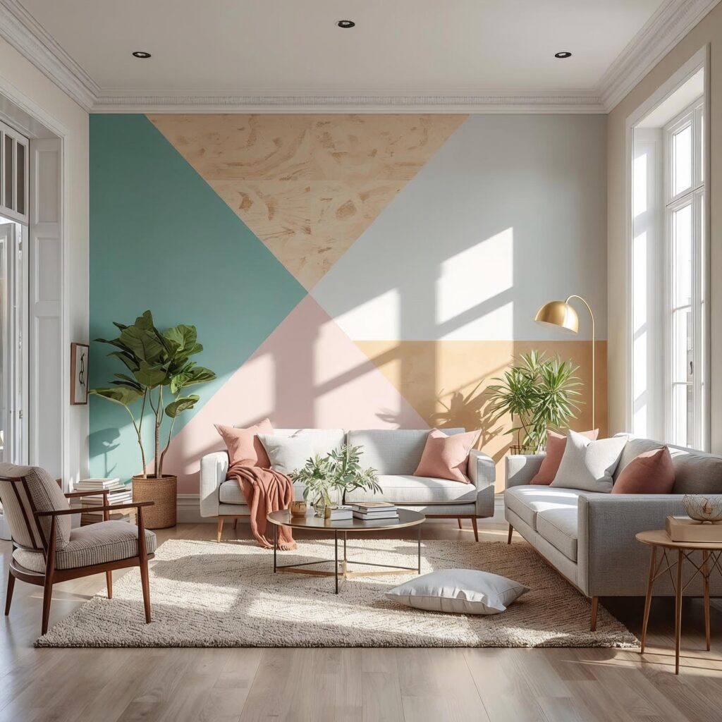 Choose one wall in your living room, bedroom, or hallway. Try geometric shapes, two-tone color blocking, or textured wallpaper. Peel-and-stick options are renter-friendly and can be removed anytime.