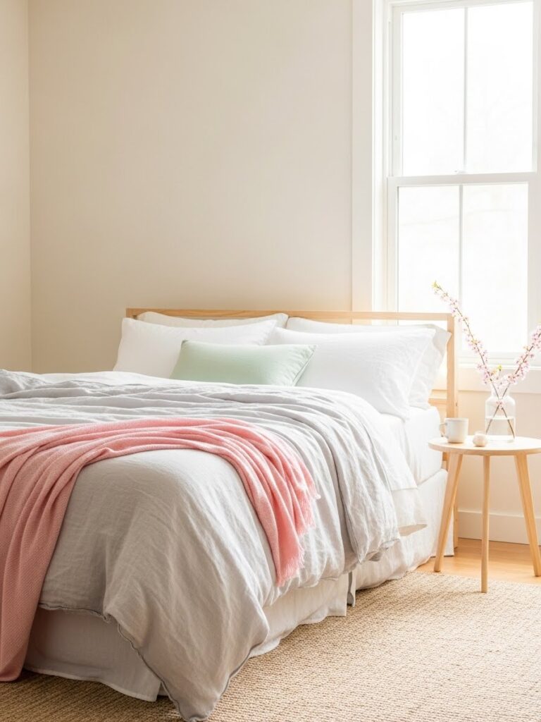 A neutral foundation allows spring accents to stand out. Keep large furniture pieces simple and layer seasonal color through accessories.
